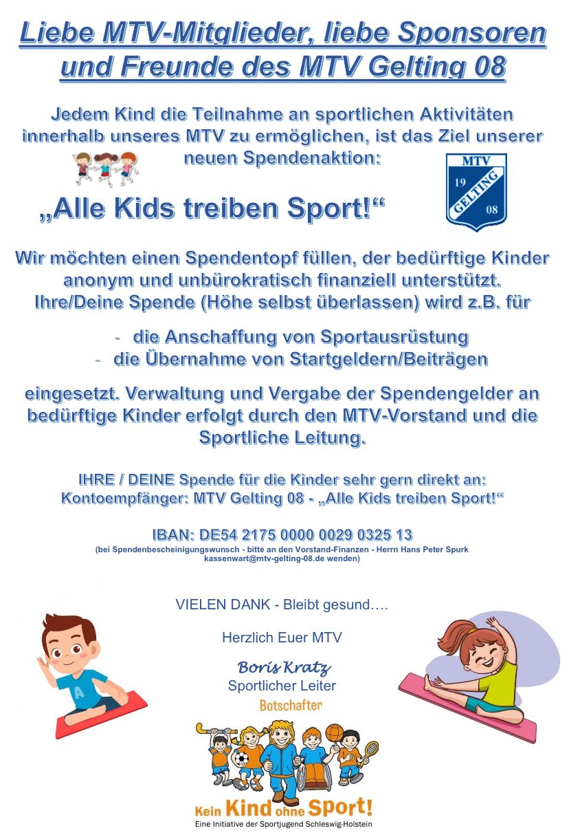 Auf dieser Seite können Sie sich über das Vereinsleben, Sportveranstaltungen, Ergebnisse des MTV Gelting, einer der größten ländlichen Sportvereine des Kreises Schleswig – Flensburg, informieren.