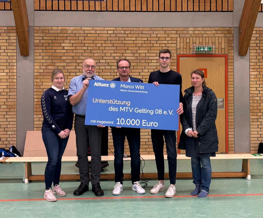 Trotz der bisherigen Unterstützung kam der Geltinger, der in Schleswig und in Gelting jeweils ein Allianz-Büro rund um die Themen Versicherungen, Baufinanzierungen und Geldanlage betreibt, auf den Verein zu und teilte mit, dass er den MTV Gelting 08 gern noch intensiver unterstützen möchte und seine Unterstützung auf ganze 10.000,00 EUR für die nächsten zwei Jahre ausweiten wird. Gesagt, getan: Feierlich überreichte Marco Witt als Allianz Generalvertreter dem Vereinsvorstand in der Handball-Halbzeitpause eines Spitzenspiels der weiblichen A-Jugend Oberligamannschaft unter großem Applaus der Geltinger Birkhalle einen großen Überweisungsträger, der diesen großzügigen Betrag auswies. „Marco, du warst und bist eine maßgebliche Säule des Vereins als Engagierter und Förderer des Sports. Vielen Dank für deine unfassbare Unterstützung für den für den Sport, für die Region, für den MTV Gelting 08.“, so Hanno Reese als Vorstandsvorsitzender, der zusammen mit seinen Vorstandskolleg*innen Maria Sönnichsen, Hans Peter Spurk und Lenja Scharf den großen symbolischen Überweisungsträger für den Verein dankbar entgegennahm.